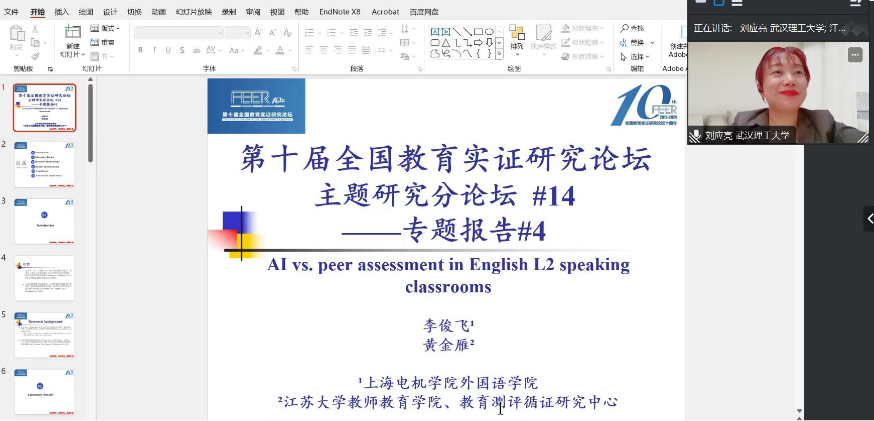The latter portion of the forum was chaired by Professor Yingliang Liu from Wuhan University of Technology. Teacher Junfei Li from Shanghai DianJi University, Dr Qiren Zhang from Yunnan University, and students Rong Wang, Yuehan Wang, and Ying Liu from Jiangsu University presented specialized reports entitled 'AI vs. Peer Assessment in English L2 Speaking Classrooms, AI vs. Teacher Assessment in English L2 Writing Classrooms, AI vs. Teacher Assessment in Chinese L2 Writing Classrooms, AI vs. Human Assessors in Large-Scale English L1 Writing Assessment, and AI vs. Teacher Assessment in English L2 Speaking Classrooms.'