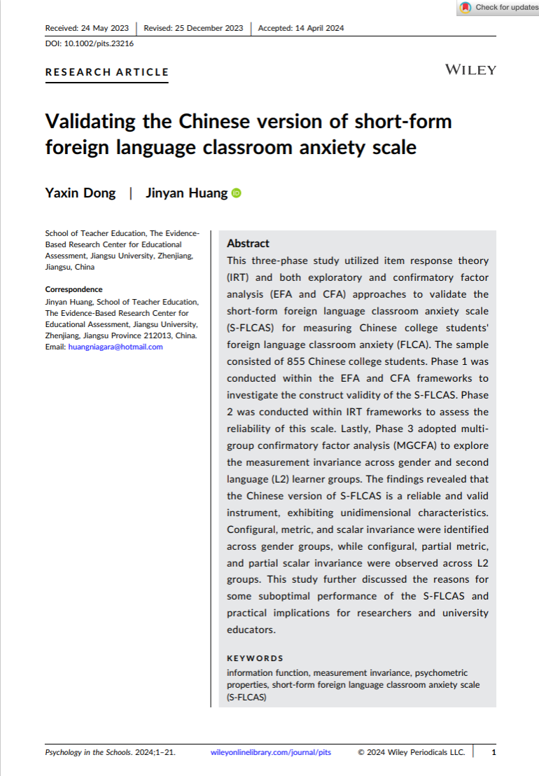 Professor Huang Jinyan, the Director of the Center for Evidence-based Education Assessment Research, recently collaborated with his graduate student Dong Yaxin to publish an academic paper in an international SSCI journal. The paper is titled "Validating the Chinese version of the short-form foreign language classroom anxiety scale." Jiangsu University is the primary institution of the author, with Professor Huang Jinyan as the corresponding author and Dong Yaxin, an academic master's student, as the primary author.