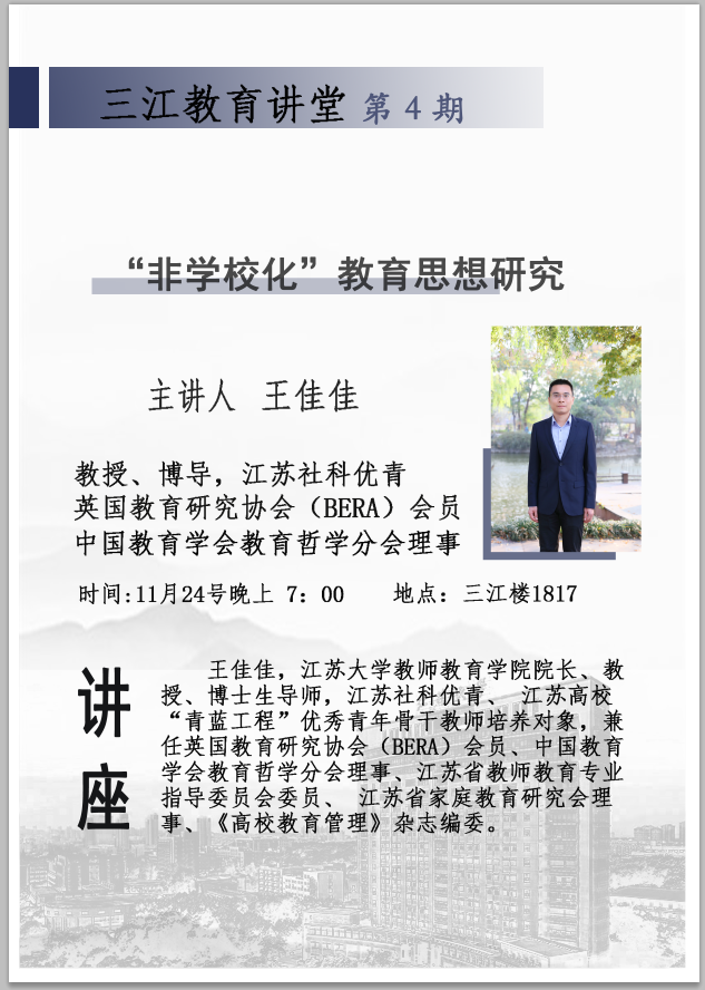 上一条:三江教育讲堂(第五期):教育改革的价值取向—从工具主义的僭越到人文理念的提升 下一条:教育讲堂:教育科研论文的选题、评价与发表——宣小红 博士