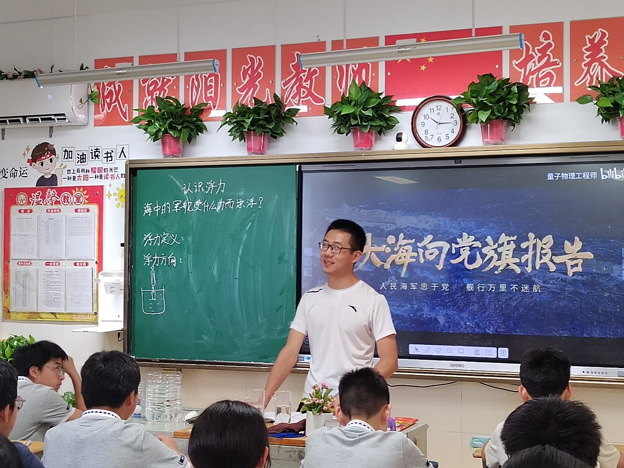 句容市华阳中学副校长杨树兵带领成人论坛 调研团老师参观校园,并一起走进八(1)班听评课,观摩物理学(师范)专业实习生柯更晰的讲课。