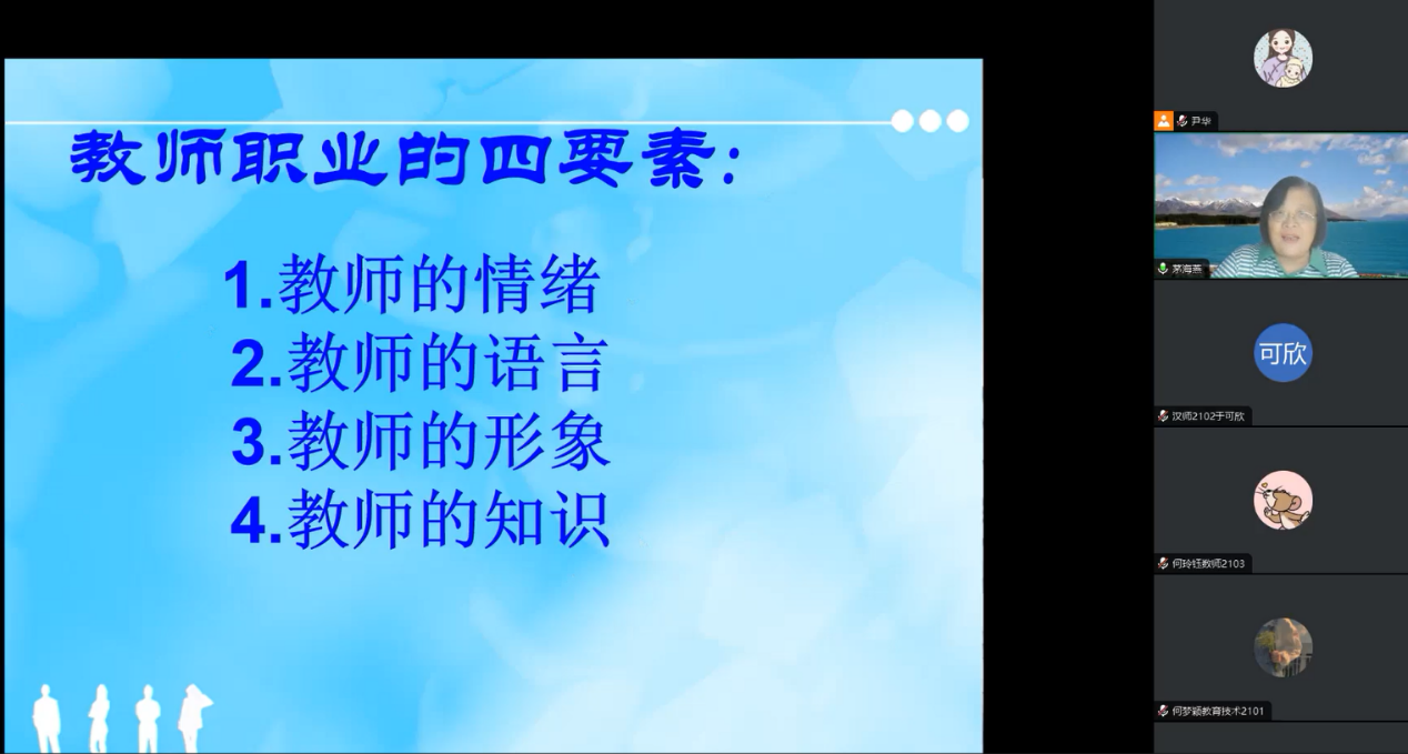 (师范学院)副院长康翠主持。康翠介绍了暑期训练计划和我校师范生的概况。接着,各专业指导教师进行交流发言,外国语学院王翔、马克思主义学院王红伟等就近年在教学技能训练方面的指导经验、学院训练安排等方面进行交流分享。提问环节,老师们一一解答同学们的疑惑,鼓励同学们抓住暑期在家时间进行教学技能的练习,互相提携,共同成长。